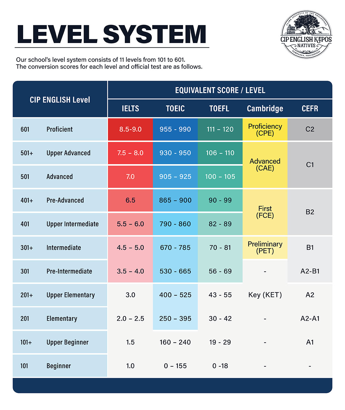 Our level system consists of 11 levels, from 101 (beginner) to 601 (proficient). Approximately 65% of incoming students are in levels 201 (elementary) to 301 (pre-intermediate). Approximately 25% of students are at the intermediate level, requiring one-on-one classes with Native speakers.