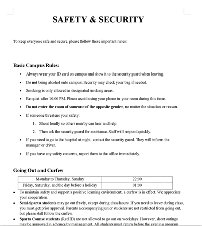 These guidelines ensure a safe environment both on and off campus. They promote respect for others in shared dormitories and explain the minimum actions to take in case of an emergency. They also include important precautions for going out or traveling.