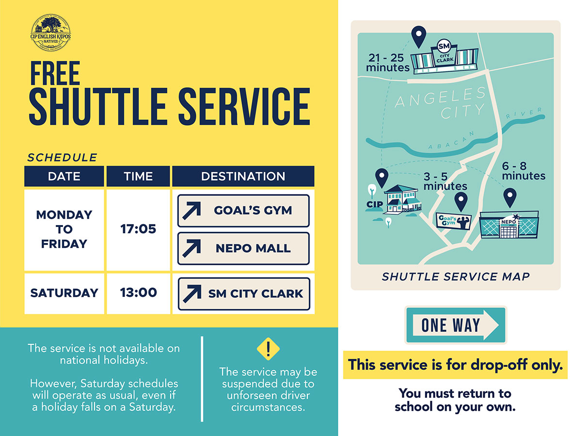 Our shuttle service operates free of charge to a nearby shopping mall like Nepo Mall every day after school. We also provide shuttle service to SM Clark on Saturdays.