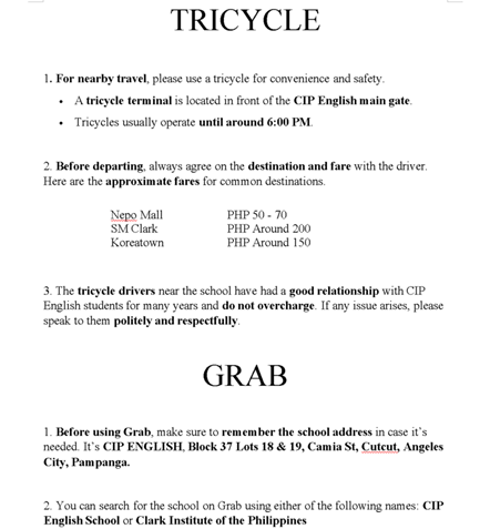 For longer distances, we recommend using the Grab app. You can find our school on Grab under “CIP English School” or “Clark Institute of the Philippines.”